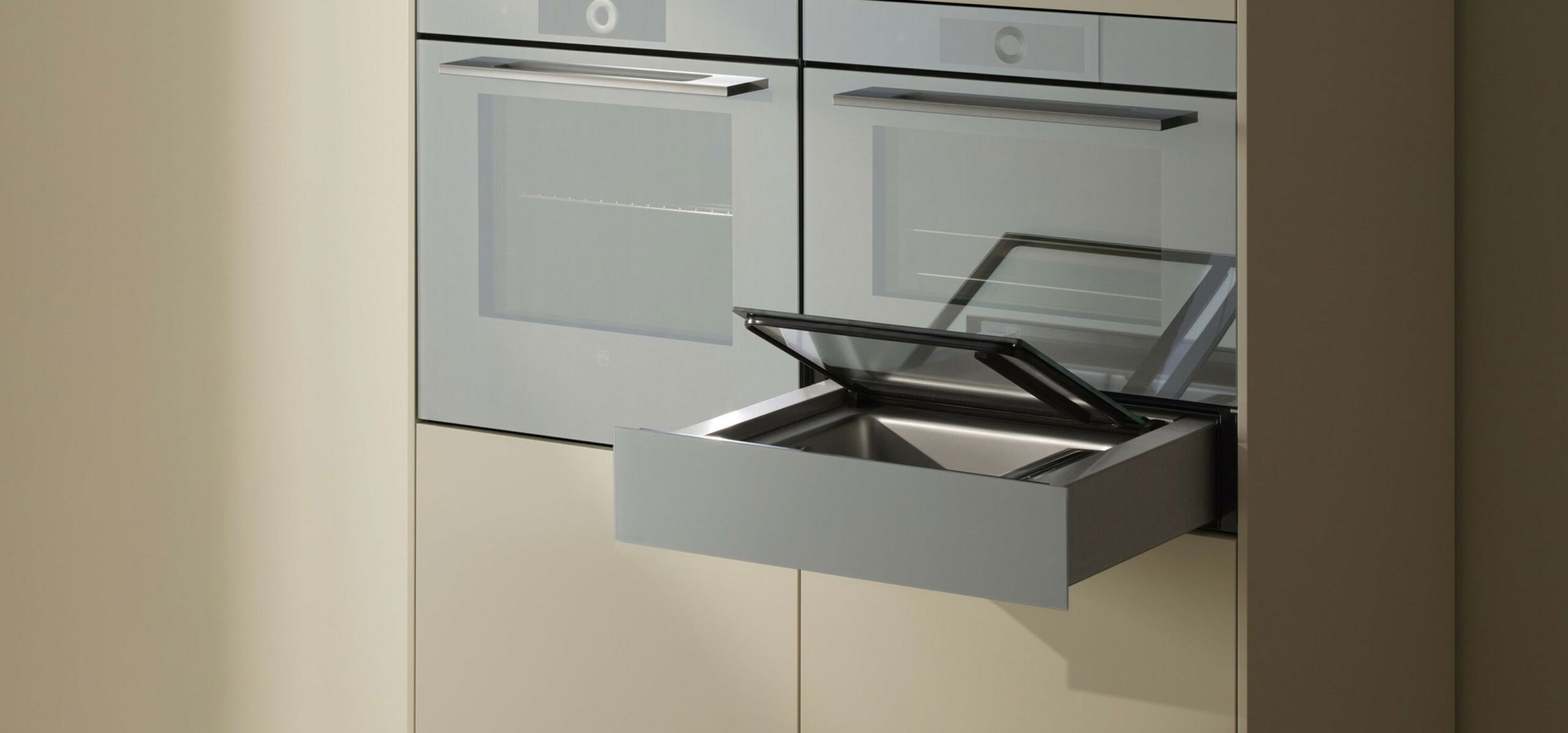 V-ZUG kitchen drawers optimally complement the aesthetics and functions of our other appliances. The mirror glass design is available in different colours, and the fully integrated version blends in seamlessly with the kitchen environment. Sophisticated TouchControl operation and simple push/pull opening make the vacuum drawers and warming drawers a stunning addition to handleless kitchens.