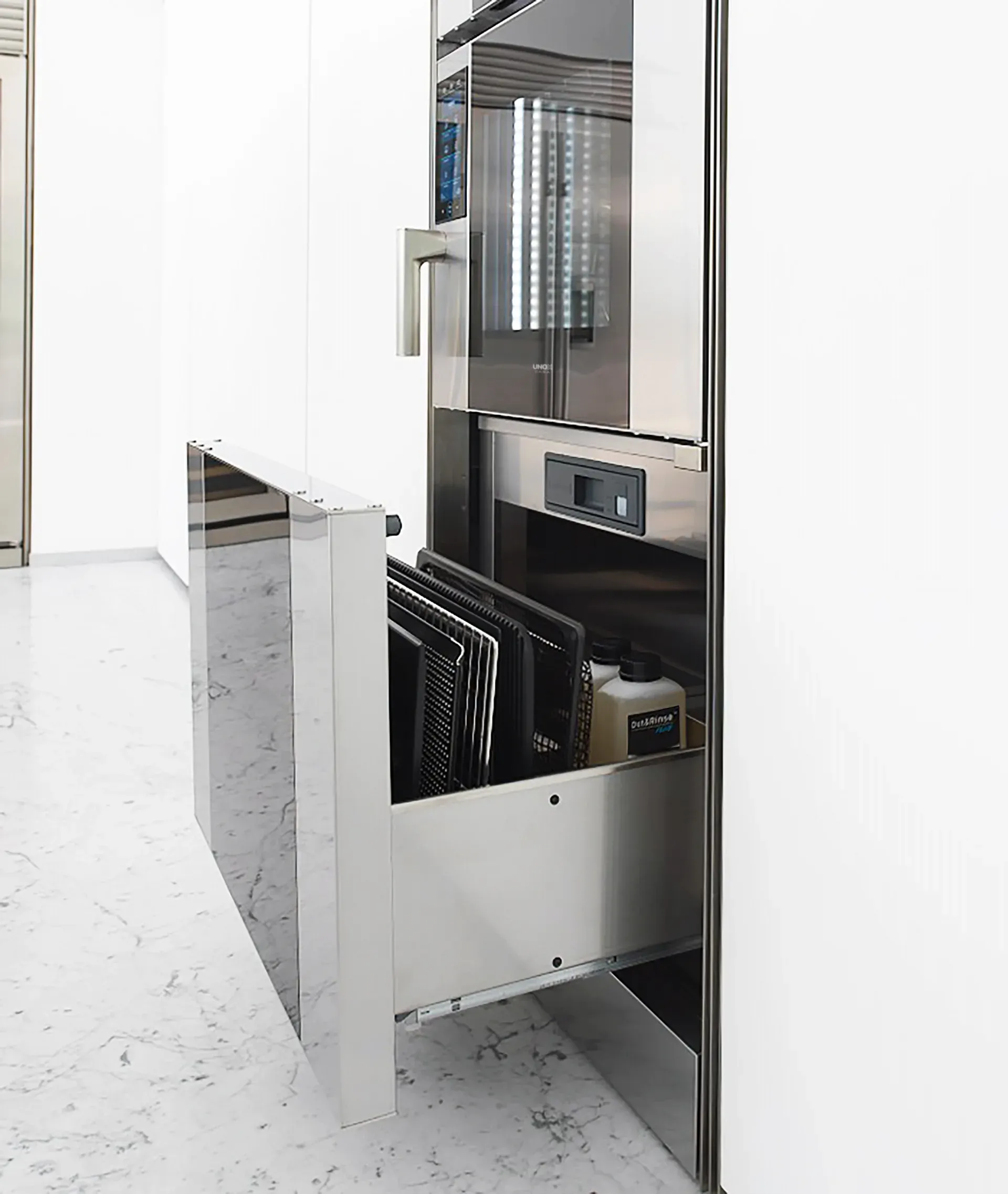 The built-in accessory drawer is meticulously designed to ensure kitchen utensils remain organised and easily accessible, from professional trays and the smoker to the detergent.