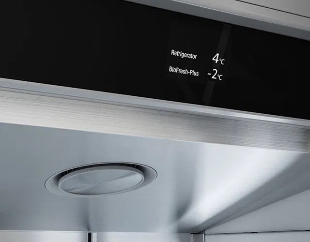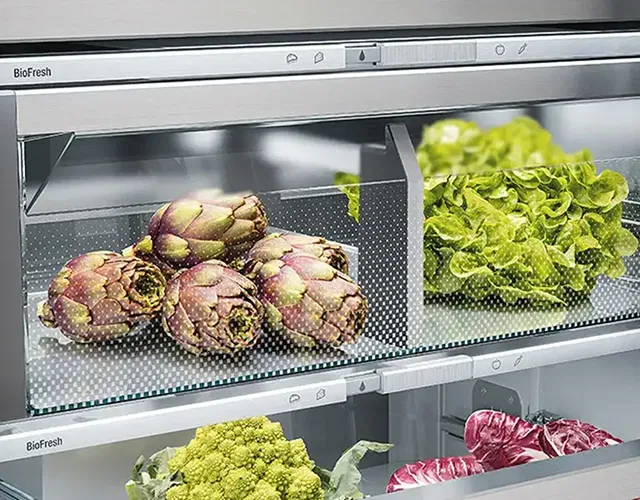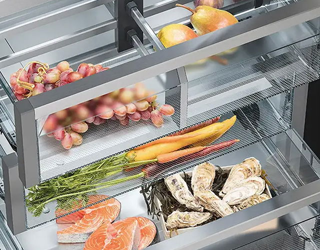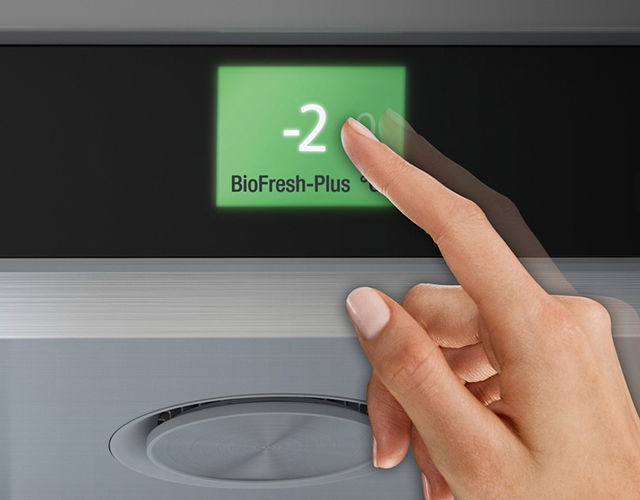 With BioFresh-Plus you have three drawers, each with independent climate control: For example, in the HydroSafe with high humidity, fruit and vegetables are stored under ideal conditions. And the DrySafe with low humidity is ideal for meat and cheese. The third drawer, with temperatures down to -2ºC, is perfect for storing fresh fish and seafood.